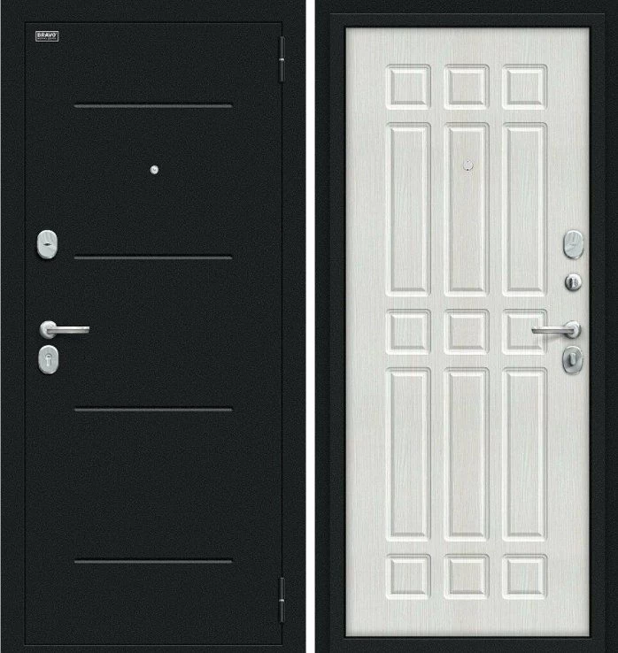 Надежная входная Дверь Браво Мило Букле черное/Bianco Veralinga премиум класса по цене 32 269 руб. Большая толщина стали защитит от проникновения в ваш дом, квартиру или коттедж. Используется очень качественная фурнитура: замки, цилиндры, ручки, защелки. Покрытие и отделка двери изготовлено под внимательным контролем производителя. Дверь имеет долгий срок службы и гарантию.