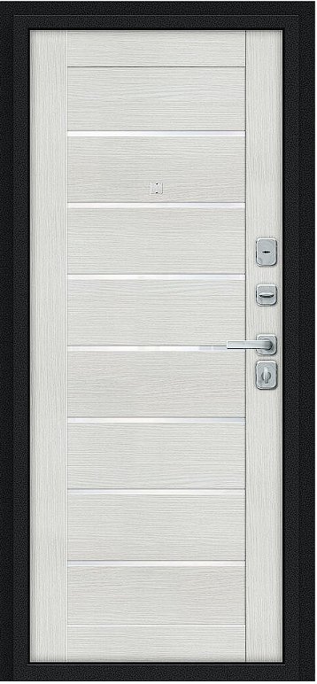 Надежная входная Дверь Браво Техно/BChrome Букле черное/Bianco Melinga премиум класса по цене 35 619 руб. Большая толщина стали защитит от проникновения в ваш дом, квартиру или коттедж. Используется очень качественная фурнитура: замки, цилиндры, ручки, защелки. Покрытие и отделка двери изготовлено под внимательным контролем производителя. Дверь имеет долгий срок службы и гарантию.